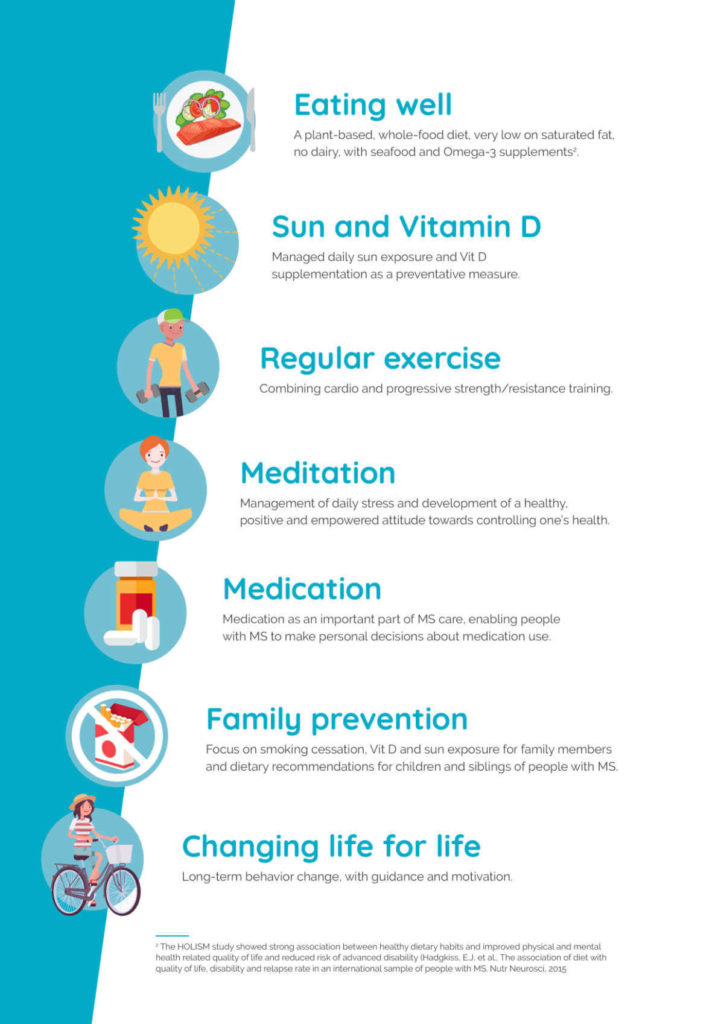 The program promotes a comprehensive and holistic approach to multiple sclerosis management. It focuses on 7 areas: